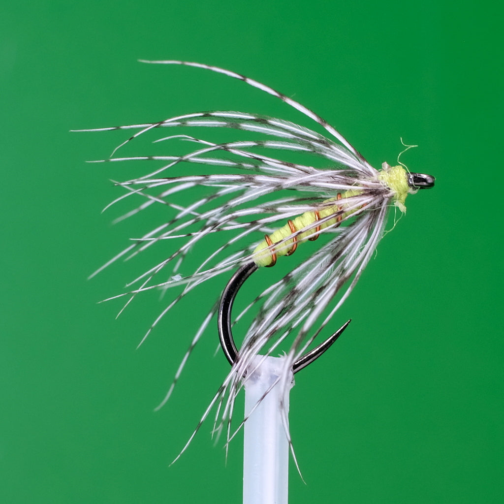 The Yellow Spider is a classic wet fly pattern that has been used in fly fishing for many years. It is a simple yet effective fly that imitates a small insect or mayfly. The fly consists of a yellow or yellow-green body made of floss or silk, and a soft hackle of hen or game bird feathers.