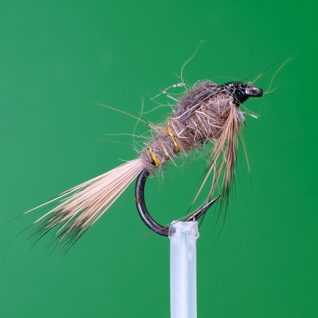 Le GRHE lesté est attaché avec un corps nervuré en fil d'or ou de cuivre et une queue en dubbing d'oreille de lièvre, qui est un matériau naturel et pelucheux provenant des oreilles d'un lièvre. La mouche est généralement lestée avec une tête de perle ou des enveloppes de fil de plomb pour l'aider à couler dans la colonne d'eau.