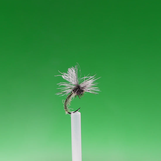 The Klinkhammer fly is designed to sit low in the water with the body hanging below the surface and the hackle and wing sitting on the surface, imitating an emerging insect that is struggling to free itself from its nymphal shuck. The fly is usually tied with a slender body and a parachute-style hackle that wraps around the body, helping to support it in the surface film.